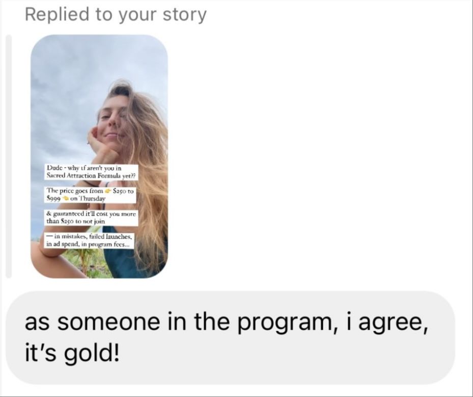 My student Jenna was fully booked with 1:1 clients and ready to scale. She used Launch Alchemy to run a last-minute group program launch and enrolled 6 women at $3,000 each from just 3 Instagram stories.