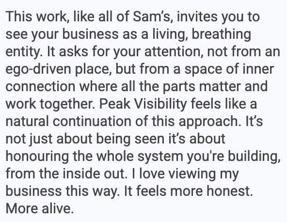 Samantha used to believe everything had to be perfectly polished before she could be visible. That belief kept her stuck, overthinking every word and delaying every post. Peak Visibility flipped that script. Now, she shows up honestly and imperfectly – in ways that feel grounded, real, and deeply connected. That one shift made it easier for her to stay consistent without the crushing pressure to “perform.”